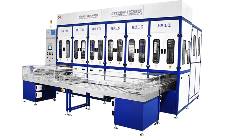 該設(shè)備有上下料網(wǎng)帶、超聲波清洗工位、噴淋漂洗工位、高壓風(fēng)切、熱風(fēng)烘干工位、溫控水加熱系統(tǒng)、風(fēng)機(jī)、溫控空氣加熱系統(tǒng)、移動式風(fēng)刀、PLC+觸摸屏控制系統(tǒng)、管路系統(tǒng)及智能電器控制系統(tǒng)等組成。自動進(jìn)排液和自動